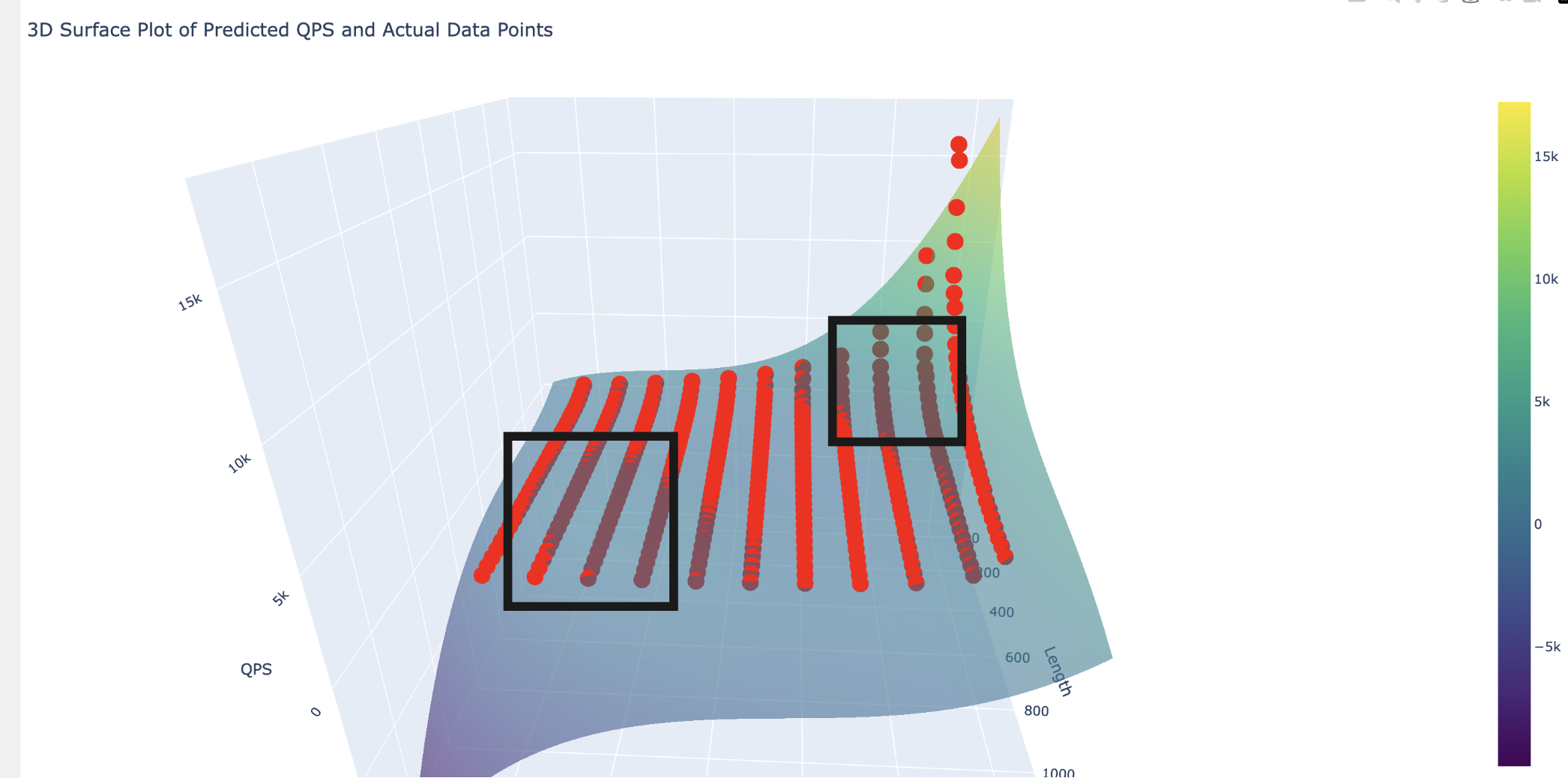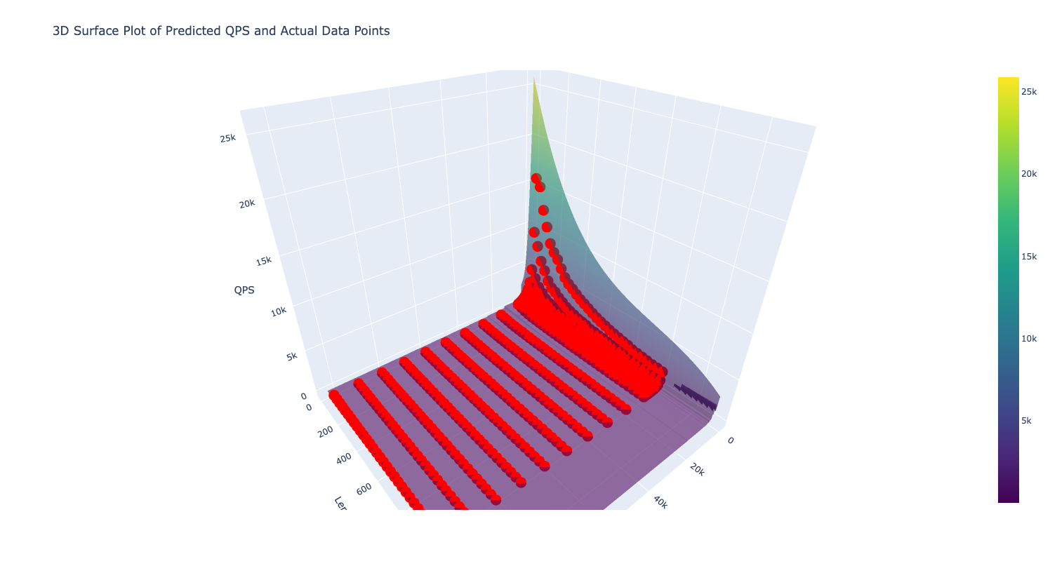 不同方法拟合效果(左:多项式,右:线性插值,其中红色点为实际 QPS 数据,曲面为预测 QPS