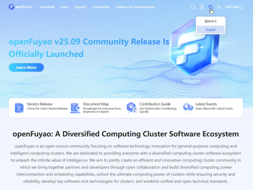 官网 www.openfuyao.cn 点击右上角语言按钮,切换中/英文版本