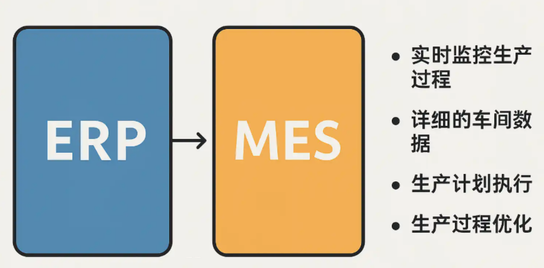 ERP → MES: ERP 将生产计划、物料清单、工艺路线等指令下达给 MES。