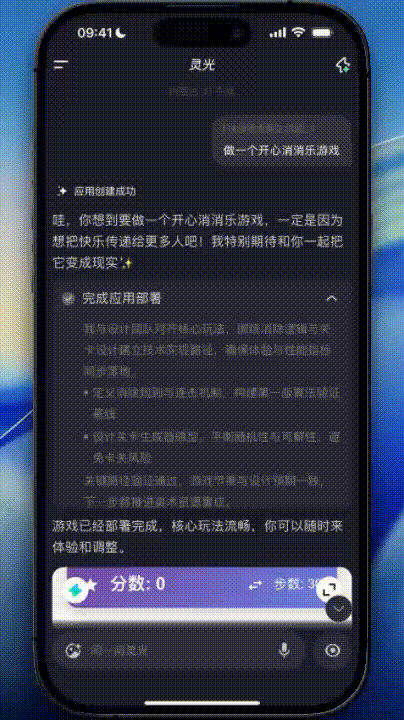 可以看到,灵光接受到请求后,开始设计、构建游戏界面框架、开发,甚至最后直接应用部署,30 秒就出来了一个可以直接玩的开心消消乐。