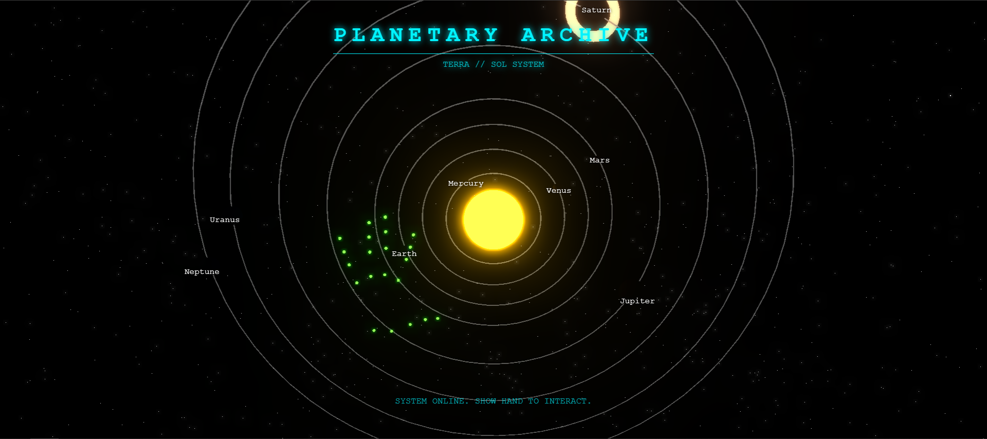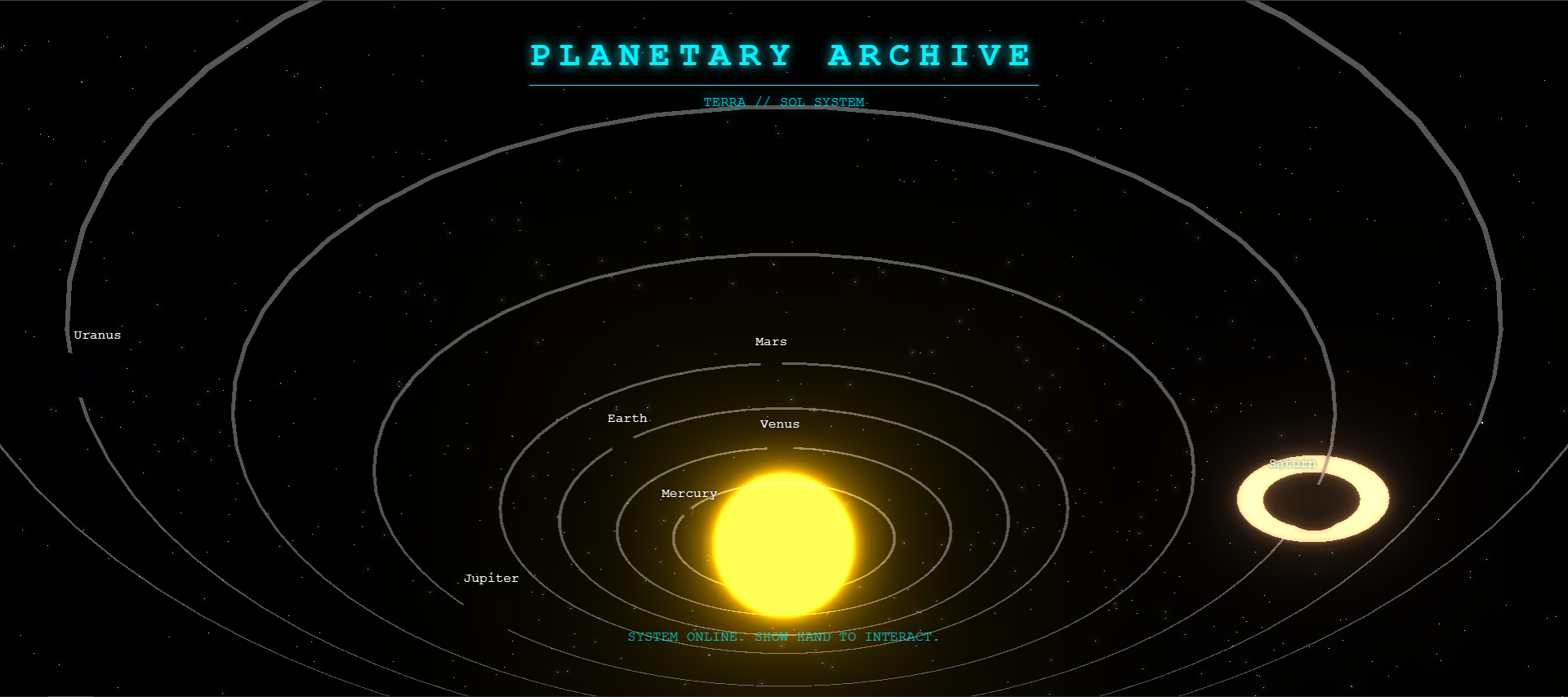 这个项目的核心目标是创建一个沉浸式的、可通过手势控制的 3D 太阳系模型。用户不仅可以欣赏到带有辉光特效的逼真天体,还可以通过摄像头捕捉的手势来与场景进行实时交互。请看 VCR