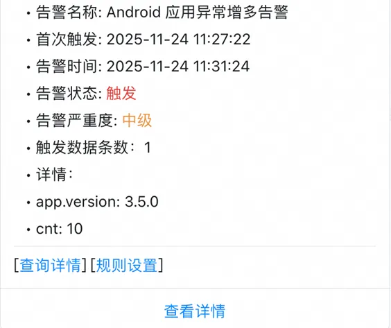 数据接入后,由于配置了告警,在线上崩溃率大幅上升时,团队研发同学会收到告警通知,第一时间关注线上问题。