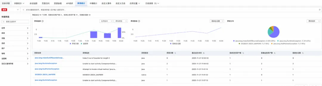 操作路径:控制台首页 → 用户体验监控 → 找到对应的 App 应用 → 异常统计。