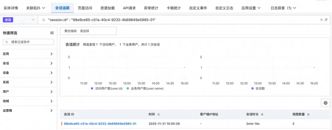 操作路径:崩溃详情页 → 选择崩溃对应的会话 ID → 查看该会话 ID 的会话追踪。