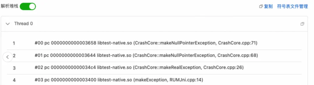 使用符号表文件解析:打开崩溃详情->异常明细->解析堆栈->选择对应的符号表文件(native 堆栈使用 .so 文件,java 堆栈使用 .txt 文件。)