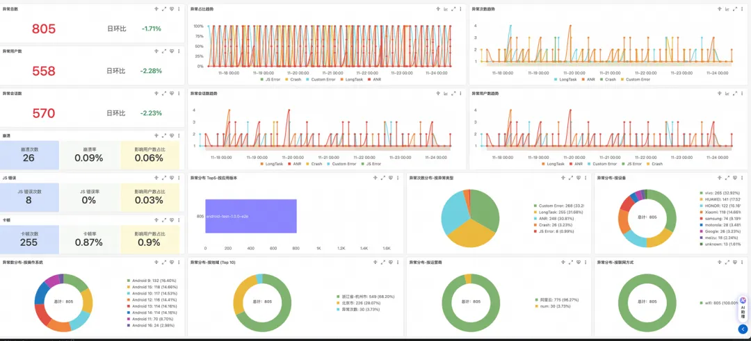 异常分析大盘中可以整体看应用的崩溃总览,包括异常总数、异常趋势、设备分布、异常类型、联网分布等其他聚合分析结果。