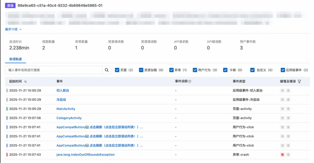 点击进入 IndexOutOfBoundsException 详情页,深入分析,验证了我们的想法,这里可以定位到崩溃版本就是新发布的 v3.5.0,发生的页面为:ProductListActivity。对应的会话 ID 是:98e9ce65-c51a-40c4-9232-4b69849e5985-01,这个信息用于我们后续分析用户行为。