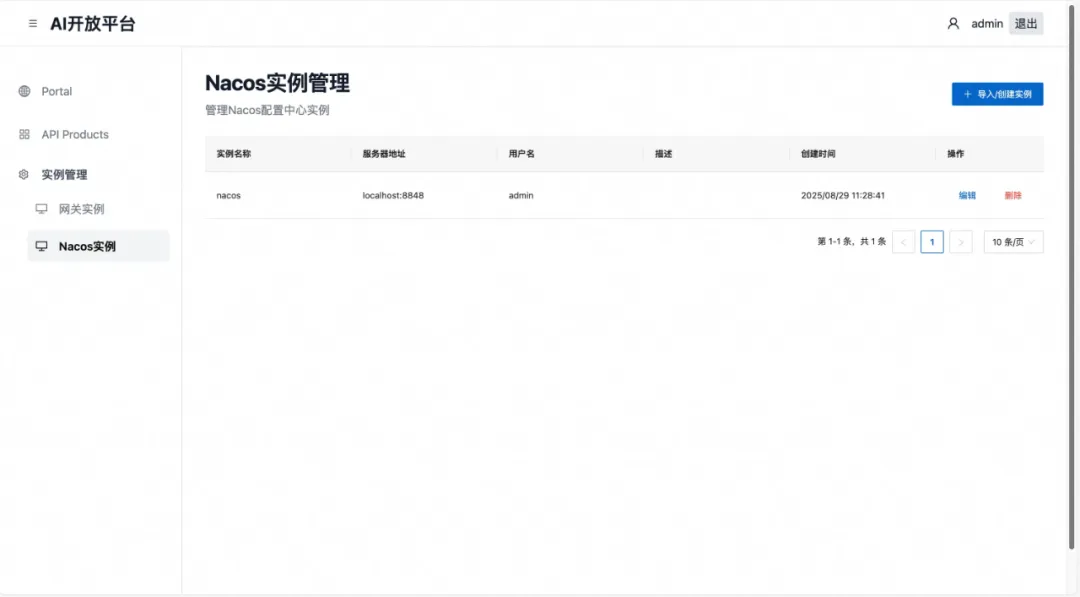 b.导入 Nacos 实例: 在【实例管理】中,导入 Nacos 。