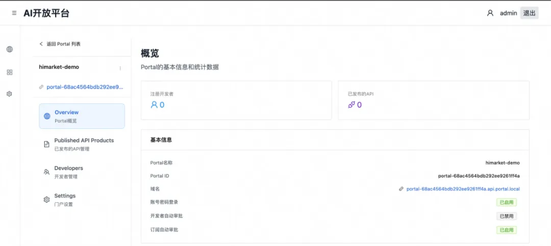3. 创建门户:在【Portal】菜单下,创建一个属于你的 AI 门户,并为其绑定一个用于本地测试的域名,如 localhost。