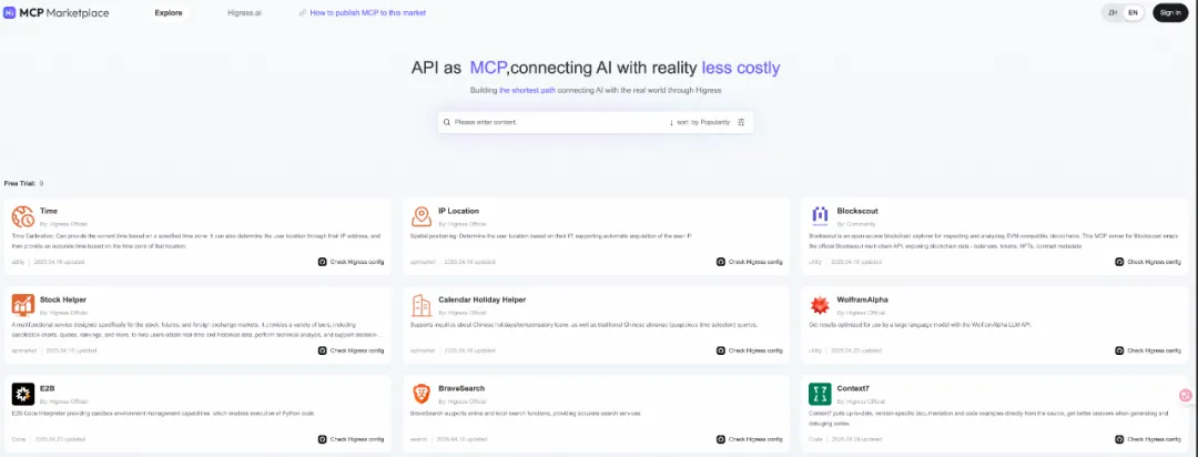 HiMarket 可以帮助企业一键拉起私有化的 MCP 市场,例如 Higress 构建的开源 MCP 市场:https://mcp.higress.ai/