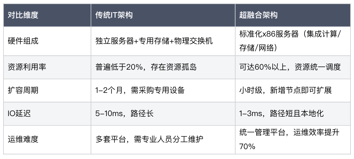为了更直观地对比,我们整理了传统架构与超融合架构的核心差异: