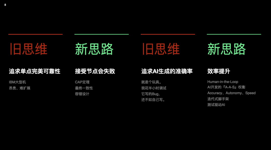 在这里,其实有一个更重要的心态变化。早年的后端世界,大家追求的是「单机极致可靠」:买一台 IBM 大型机,硬件质量、机房环境、运维流程都做到极致,希望这台机器永远不要挂 。后来互联网规模上来了,这套理念撑不住了。像 Google、Amazon 这些公司开始做分布式系统,默认前提变成: