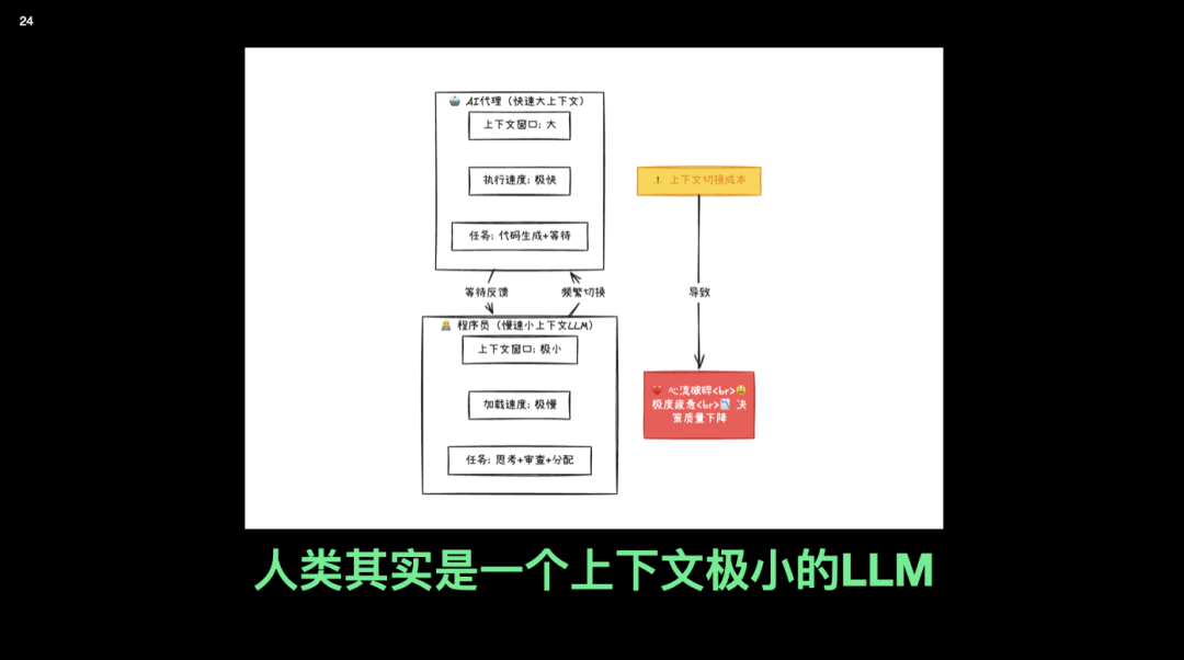 抽象来看,我把人类大脑也画成一个 LLM,计算力很强,但是上下文窗口极小 ,对频繁切换任务特别不友好