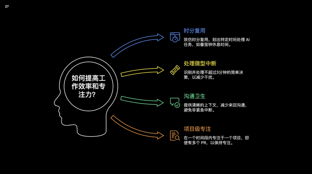 时分复用 AI。 一段时间专门用来写 prompt、定义任务,把「我要干什么」说清楚;然后开几个 Agent 让它们去跑,自己去做别的事情;下一段时间再集中验收这些产出,而不是生成一段就立刻审一段
