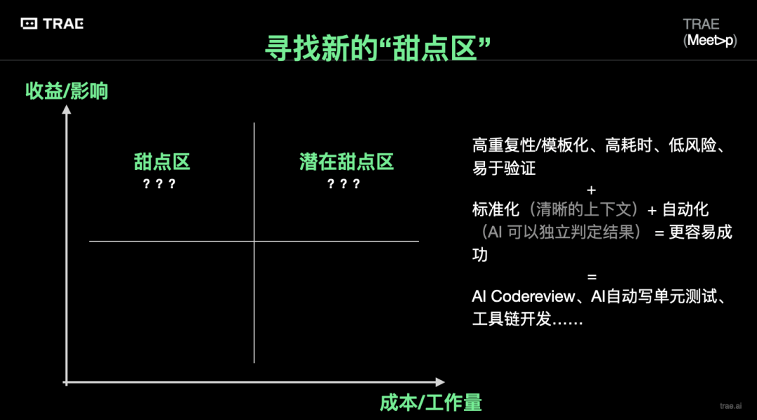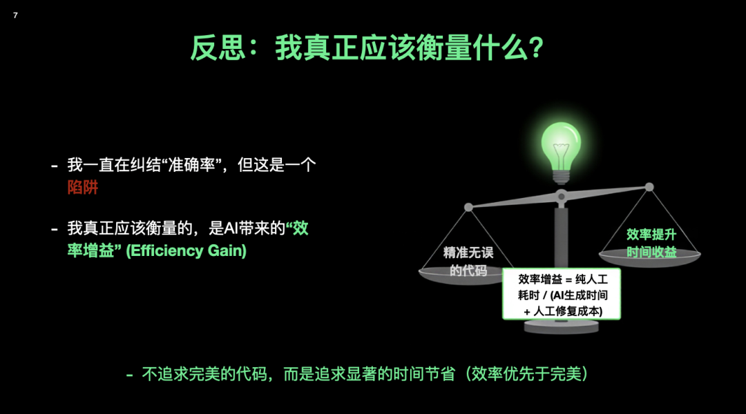 翻成白话就是,如果我自己写要 8 小时,AI 帮我生成用了 30 分钟,我再花 1 小时改一改,那我其实是用 1.5 小时,干完了原来 8 小时的活。代码不用完美,只要划算。
