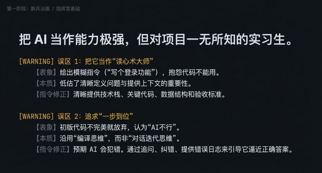 这个时候,一个对我非常有用的比喻是:把 AI 当成一个「能力很强、但完全不了解你项目背景的实习生」。 它的「算法水平」可能比大多数同事都强,但一上来对你的业务、代码风格、一堆历史坑完全没有概念。如果你只丢一句「帮我写个登录」过去,本质上就是在期待它读心。