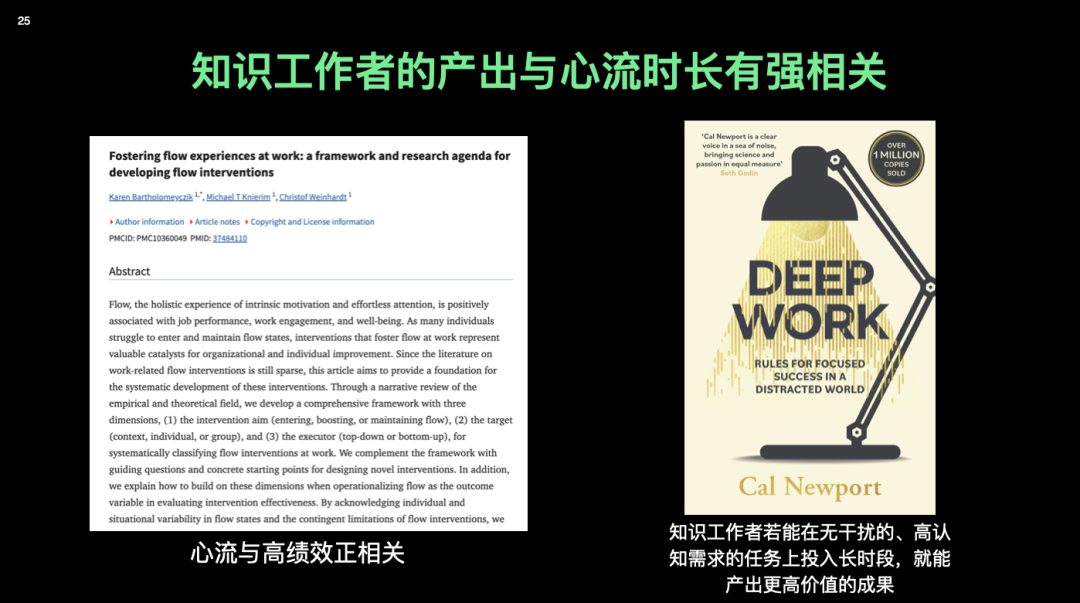 再加上心理学里说的「心流」(flow):研究表明,知识工作者如果能在高认知负荷、少干扰的 任务上 保持较长时间的心流状态,产出会显著提高。