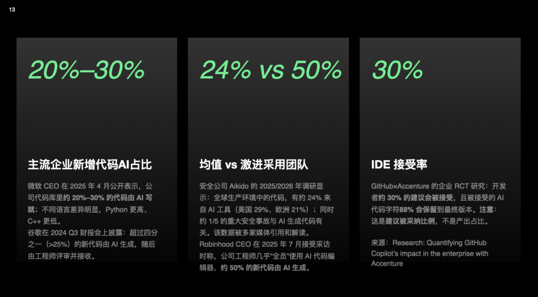 在我演讲的 PPT 里,放了几组公开数据:比如 GitHub×Accenture 的企业实验、安全公司 Aikido 的调研等等。大致结论是:
