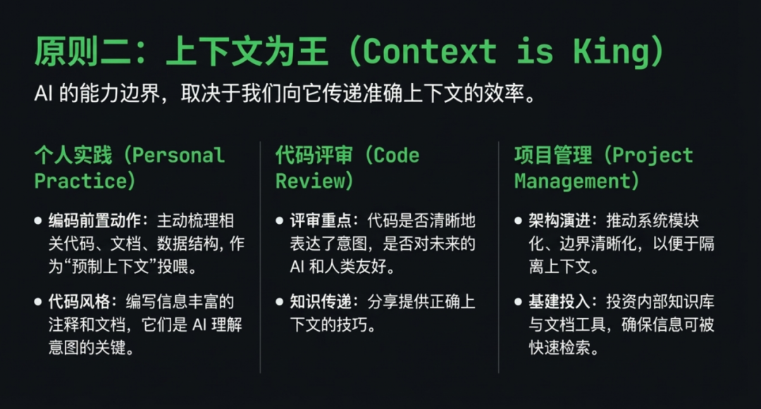 AI 的能力上限,很大程度上取决于你给它的上下文。比如,你有没有把业务背景、技术约束、决策过程写出来?项目里有没有可复用的接口设计、术语表、测试用例、决策记录?