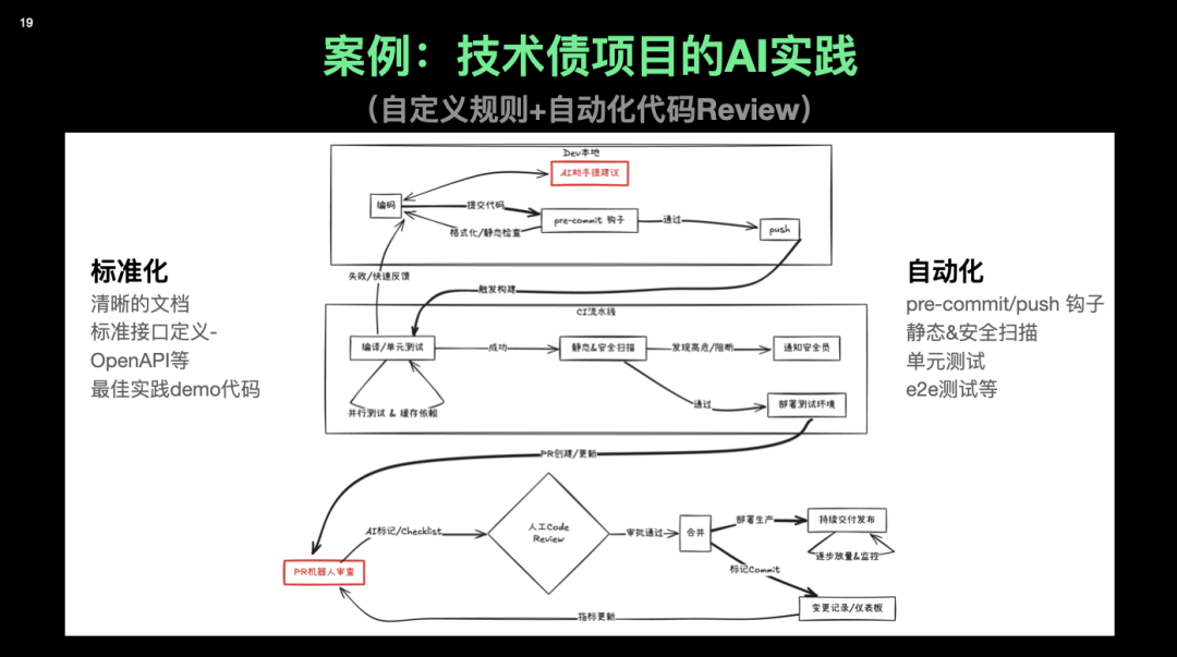 我在一个技术债很重的项目上就这么干过。先用 AI 帮忙总结出一套「我们自己的代码规则」,再写脚本,让 AI 根据这些规则自动扫 PR、自动提建议,人类 Review 只需要关注真正困难的设计问题。几个月下来,Review 压力肉眼可见地下来了,线上 Bug 的数量也稳定下降了。
