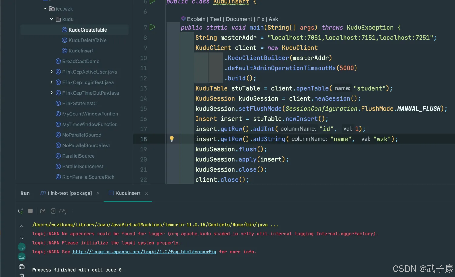 public static void main(String[] args) throws KuduException { String masterAddr = "localhost:7051,localhost:7151,localhost:7251"; KuduClient client = new KuduClient .KuduClientBuilder(masterAddr) .defaultAdminOperationTimeoutMs(5000) .build(); KuduTable stuTable = client.openTable("student"); KuduSession kuduSession = client.newSession(); kuduSession.setFlushMode(SessionConfiguration.FlushMode.MANUAL_FLUSH); Insert insert = stuTable.newInsert(); insert.getRow().addInt("id", 1); insert.getRow().addString("name", "wzk"); kuduSession.flush(); kuduSession.apply(insert); kuduSession.close(); client.close(); }