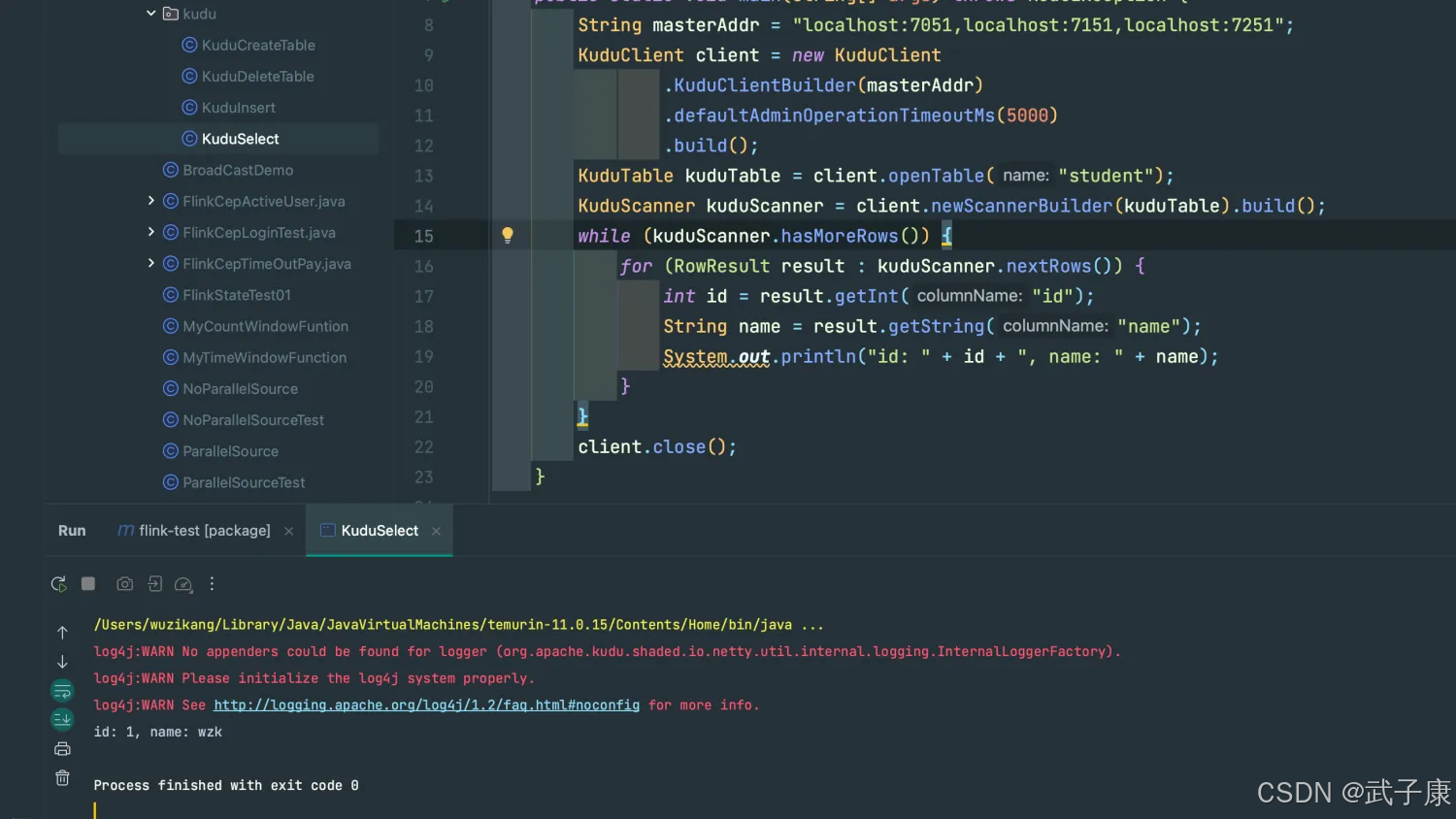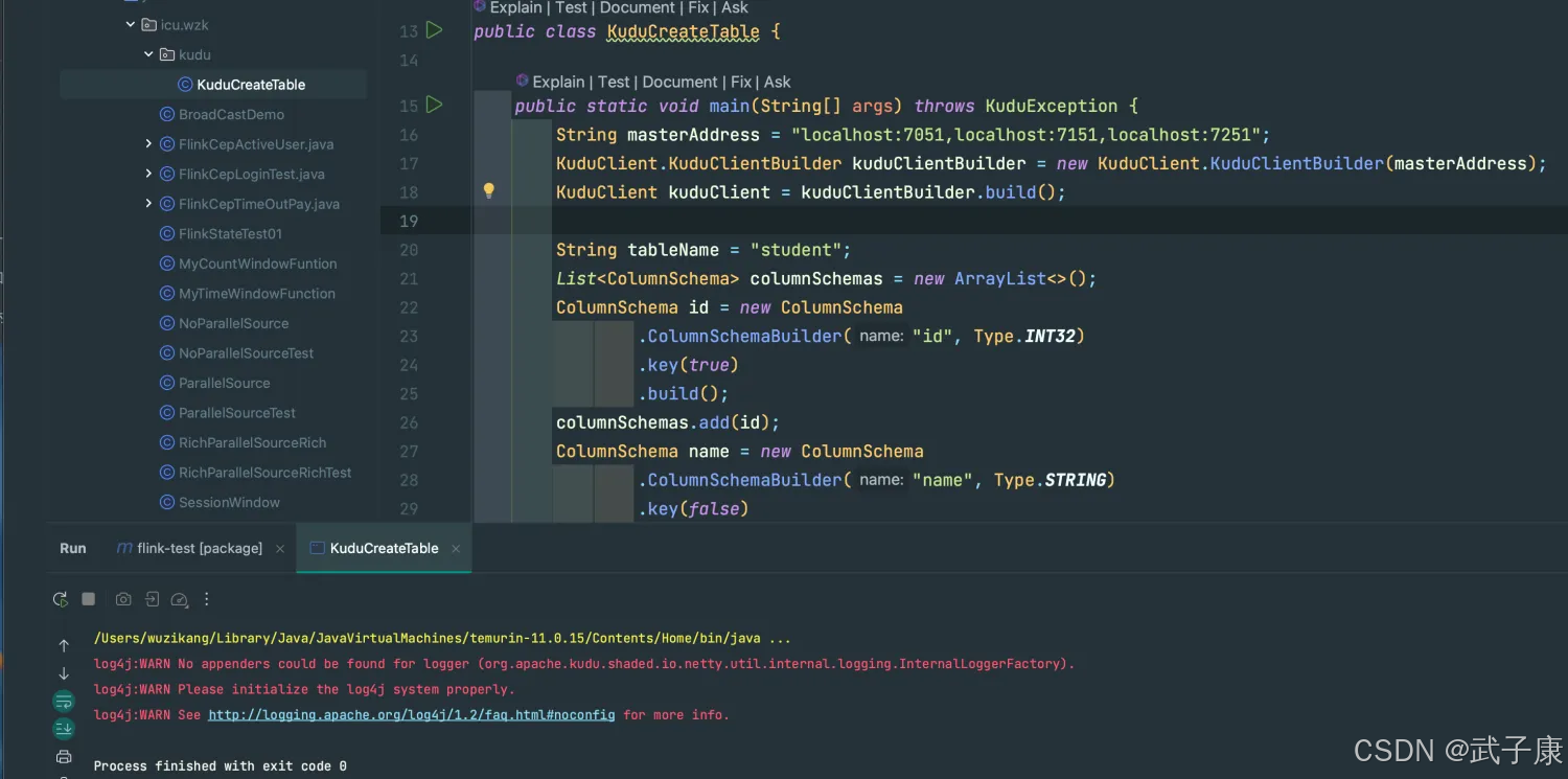 场景:用 Java(kudu-client 1.4.0)在本地多 Master 集群上完成 Kudu 表的建表、增删改查全流程。