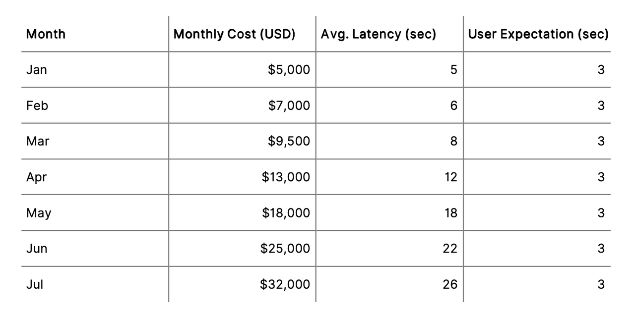 第二张表格则以具体数据支撑了这一趋势,详细列出了每月的成本、延迟及用户期望值,进一步凸显了系统性能与用户体验之间的显著差距。