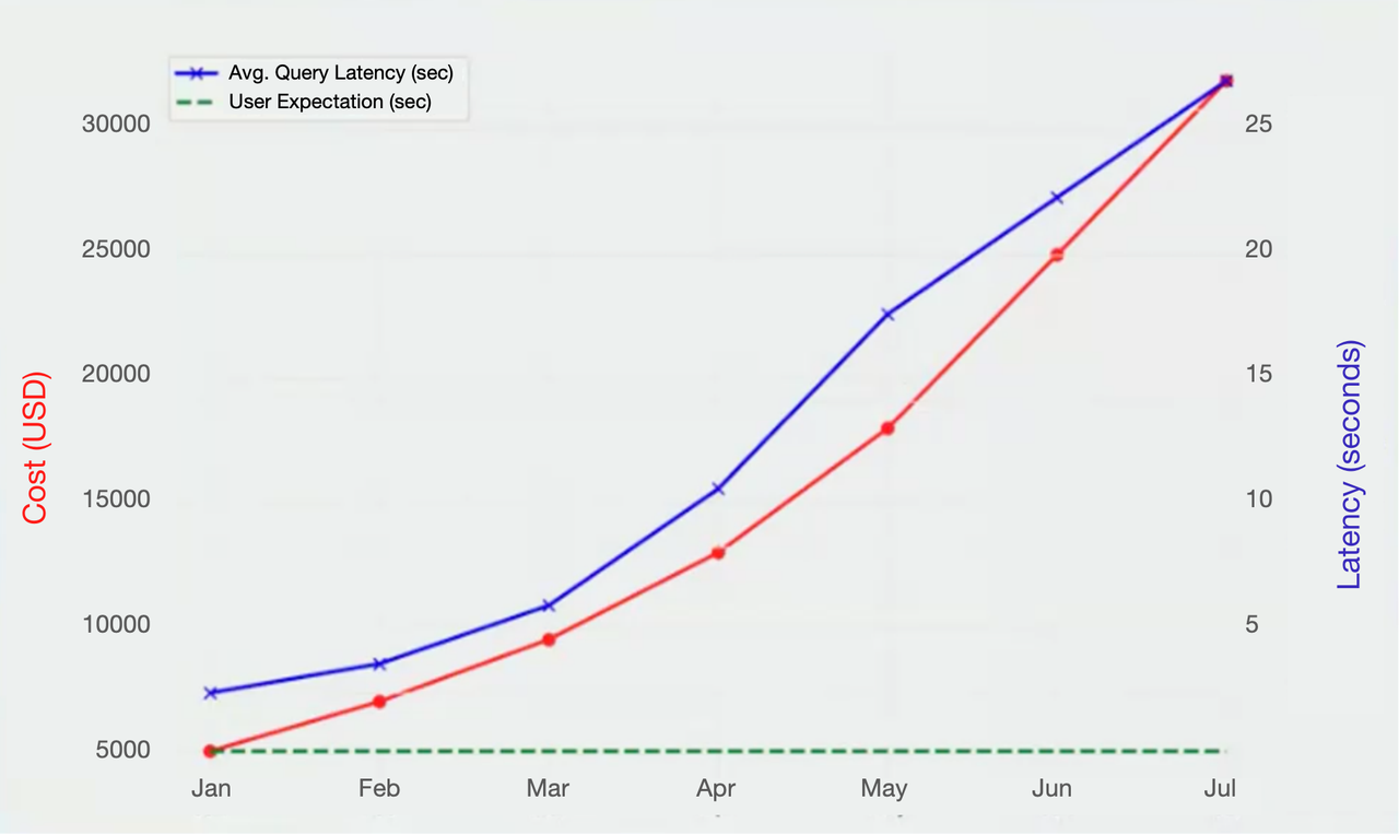 第一张折线图清晰呈现了从一月到七月期间,月度成本(红色曲线)和平均查询延迟(蓝色曲线)的持续攀升趋势:成本从 5,000 美元迅速上涨至 32,000 美元,而查询延迟也从 5 秒飙升至 26 秒,远超用户期望的 3 秒阈值(绿色虚线)。