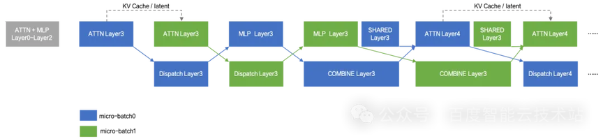 为实现这一目标,社区广泛采用 Two-Batch Overlap(TBO)技术:将一个 batch 拆分为两个 micro-batch,在层(layer)维度交错执行。具体而言,系统交替处理两个 micro-batch 的各层计算,并安排其中一个 micro-batch 的计算与另一个 micro-batch 的通信在时间上并行,形成流水线式的重叠。