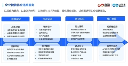 • 顶层设计与战略对齐,绘制清晰 AI 发展蓝图。在战略咨询阶段,商汤大装置专家服务主要帮助客户构建清晰的 AI 战略和发展蓝图,评估企业 AI 成熟度与数据资产,协助规划从试点探索到规模化应用的实施路径,确保 AI 战略与核心业务目标深度对齐。