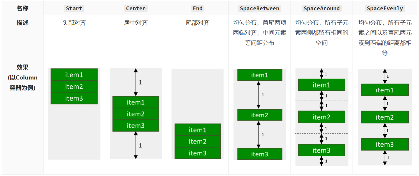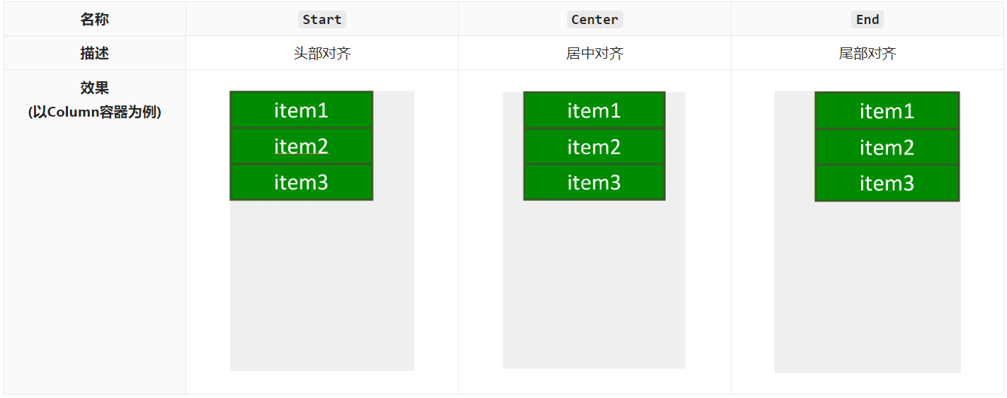// 对于Column容器来讲是HorizontalAlign,对于Row容器来讲是VerticalAlign,两者都是枚举类型,可选择枚举值也都相同