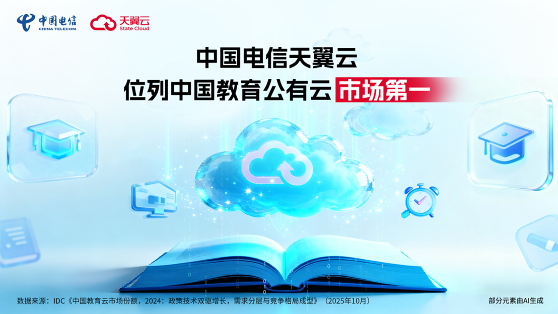 近日,国际数据公司 IDC 发布的《中国教育云市场份额,2024:政策技术双驱增长,需求分层与竞争格局成型》(Doc# CHC53785125,2025 年 10 月)报告显示,中国电信天翼云以 16.38%的市场份额位居中国教育公有云市场第一,凭借领先的产品、解决方案以及高效的服务,展现了在教育云领域的强劲科技实力与市场领导力。
