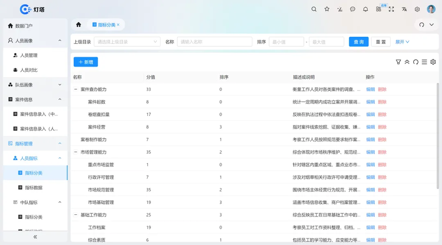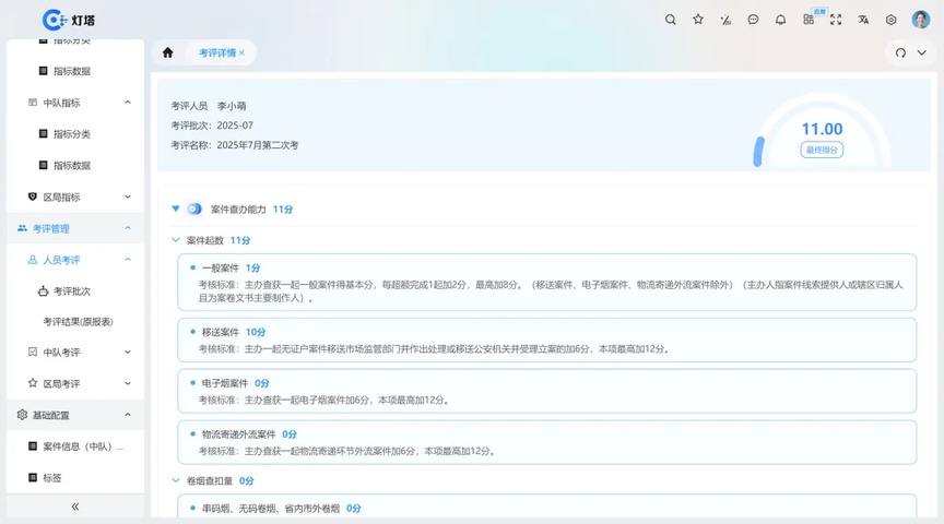 系统建立了科学完善的考核指标体系,涵盖案件查办、市场管理、基础工作等多个能力维度。指标权重可根据实际管理需求灵活调整,确保评价的针对性与有效性。