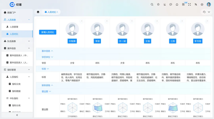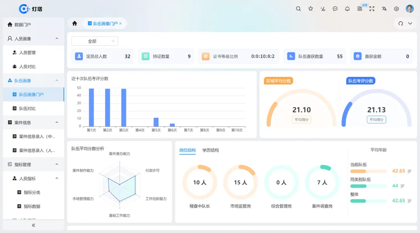 系统门户以“清晰直观、一目了然”为设计原则,集成了人员结构统计、单位绩效分析、队伍趋势预测等核心功能。