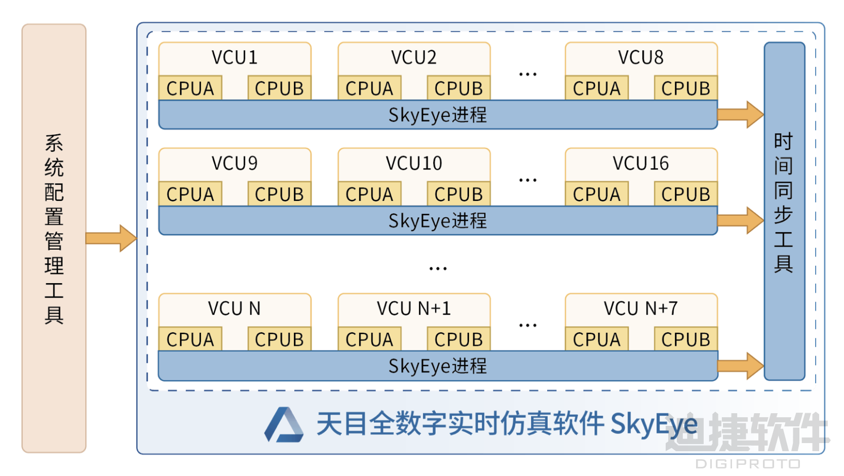 这套系统的底层仿真能力正是由天目全数字实时仿真软件 SkyEye 提供。作为一款面向嵌入式系统的行为级硬件仿真平台,SkyEye 不仅支持多架构处理器的高性能仿真,还具备可视化建模能力,能够在物理硬件尚未制造的前提下,从指令执行、外设响应到总线通信实现高保真还原。SkyEye 为控制器仿真方案提供了处理器级建模、虚拟多模块协同、时序同步等核心能力,成为支撑复杂嵌入式控制系统数字样机实现的关键基础平台。