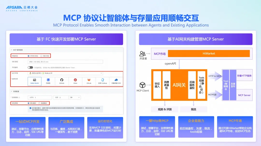 除了打通存量系统,企业还需要不断构建新的智能体工具,尤其是基于 MCP(Model Context Protocol)这一新兴标准协议。但难题在于,如何快速开发、部署和管理 MCP Server,使其能够与智能体无缝衔接。如果缺乏高效的开发运行环境,企业在创建 MCP Server 时往往面临资源准备复杂、部署周期长、难以保证弹性与安全的问题。