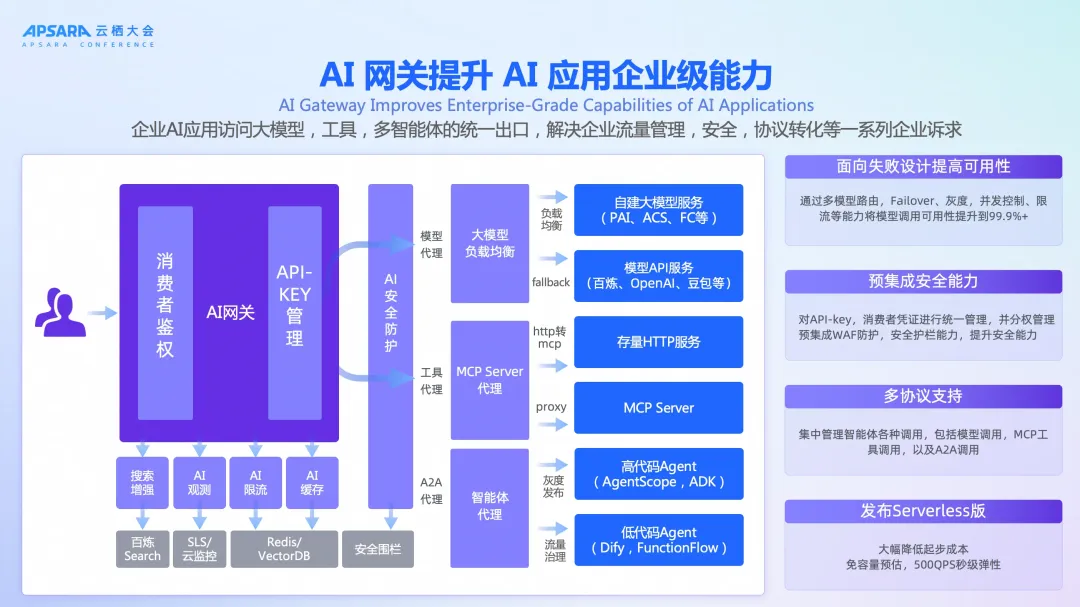 阿里云云原生 API 网关正是针对这一场景而设计:它通过协议适配、流量治理、内置安全和可观测能力,将传统 API 平滑地转化为智能体可消费的服务,从而帮助企业低成本实现智能化升级。它具备: