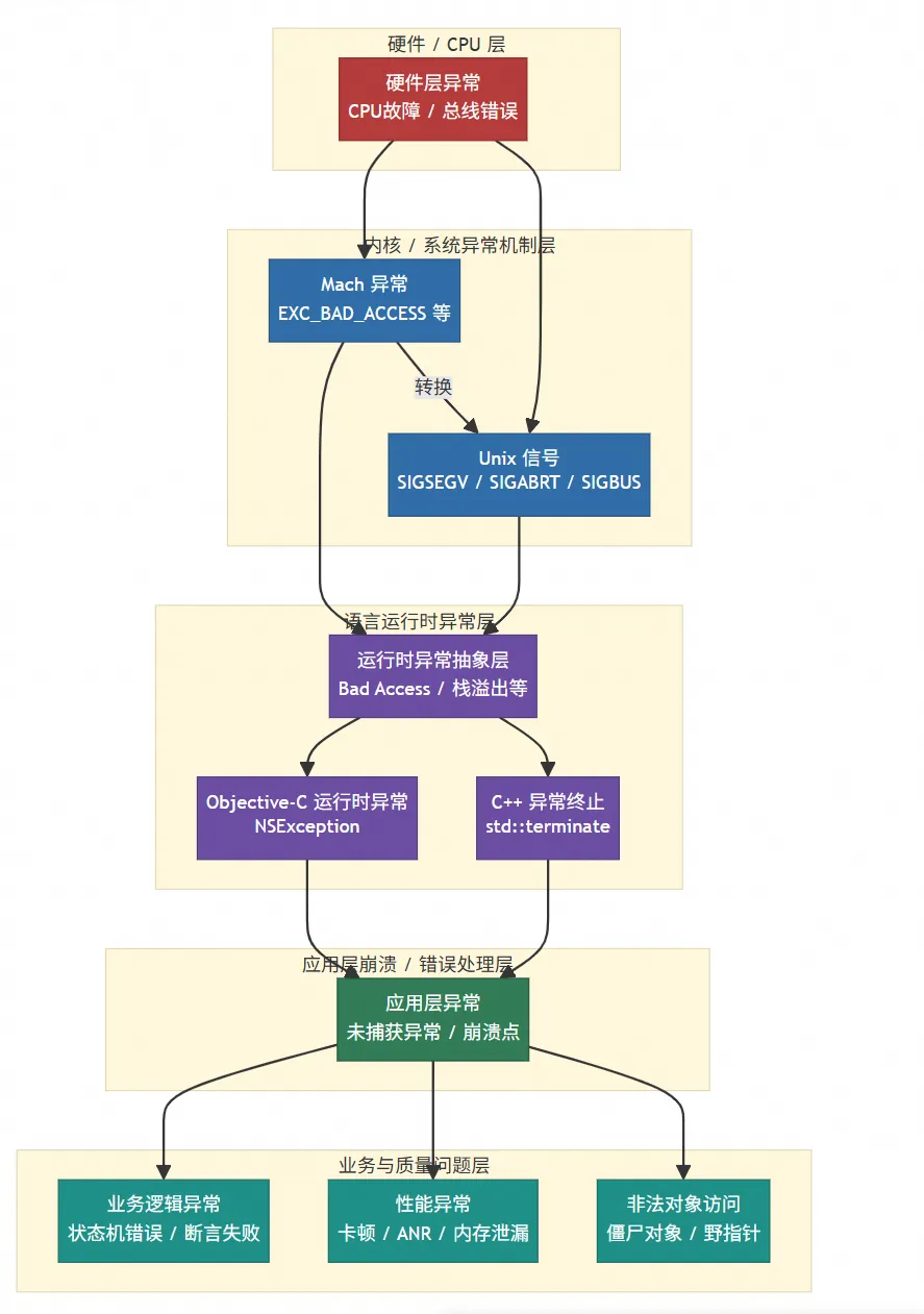 iOS 异常体系采用分层架构,从底层硬件到上层应用,异常在不同层次被捕获和处理。理解异常体系的分层结构,有助于我们更好地设计和实现异常监控方案。iOS 异常体系主要分为以下几个层次:
