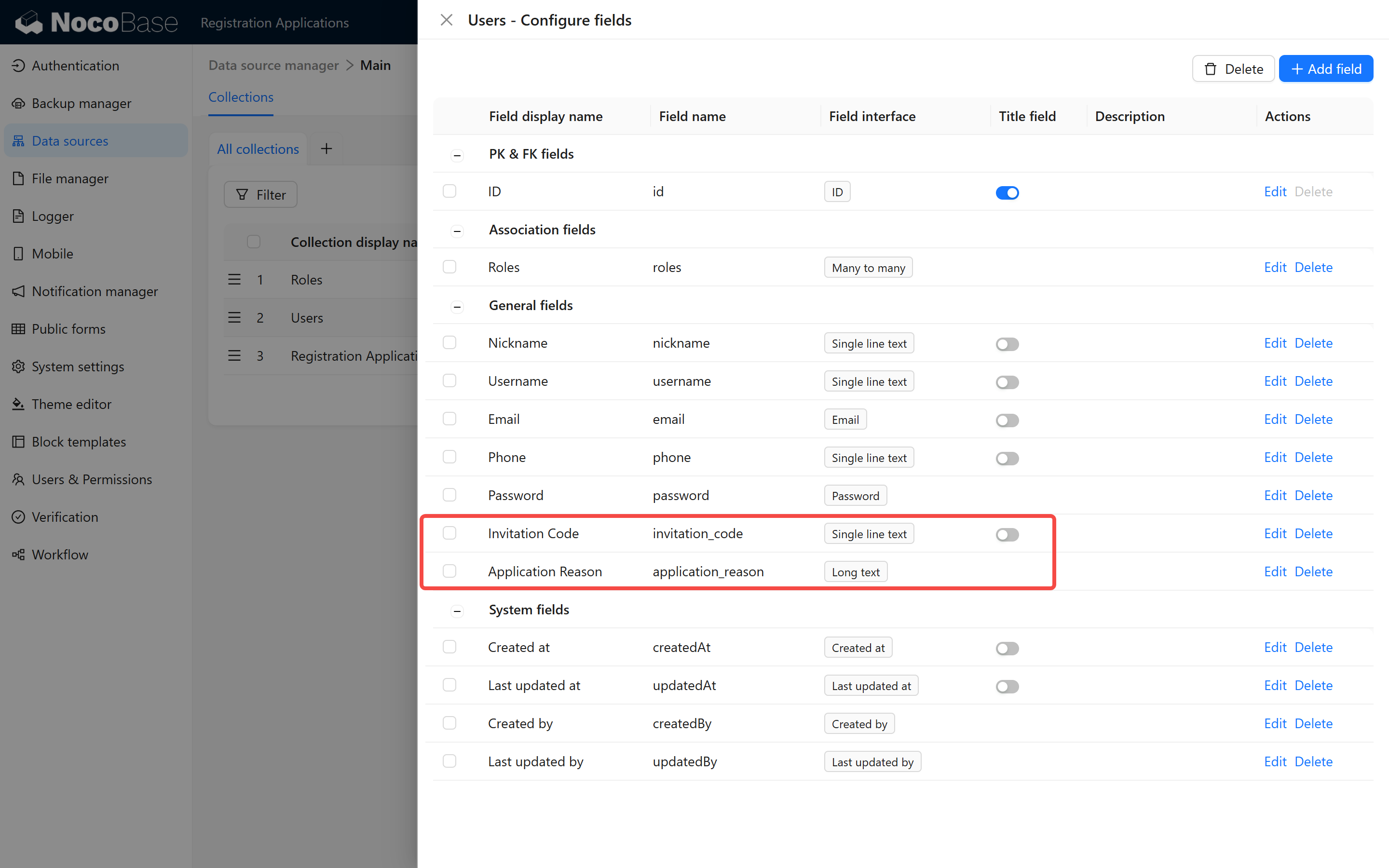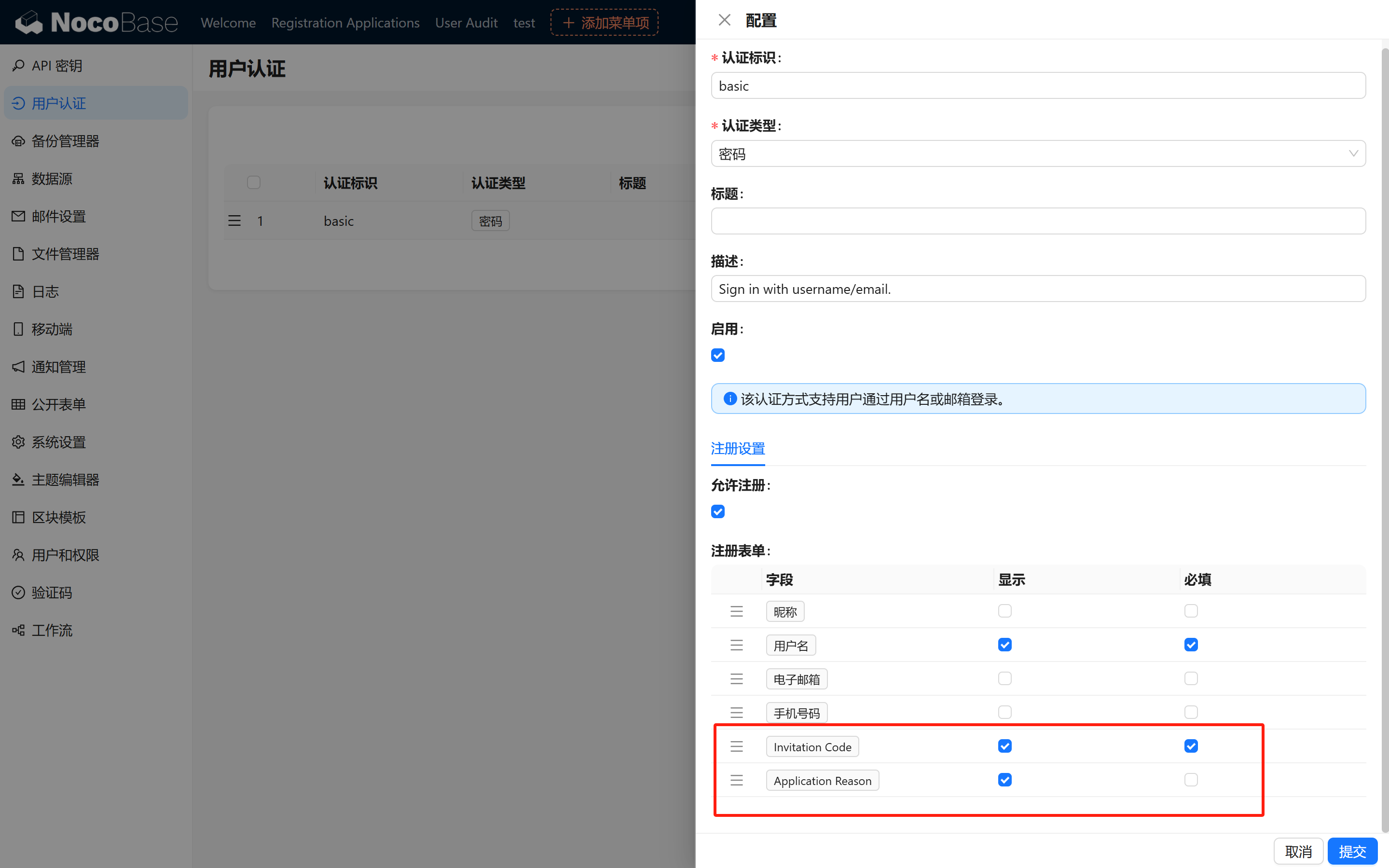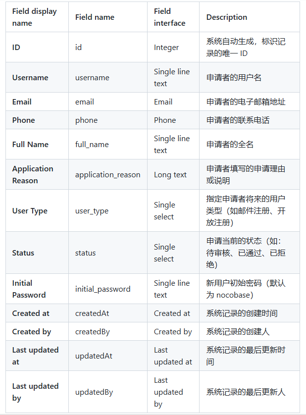 创建表在 NocoBase 后台新建一张表,用于存储用户注册申请信息。