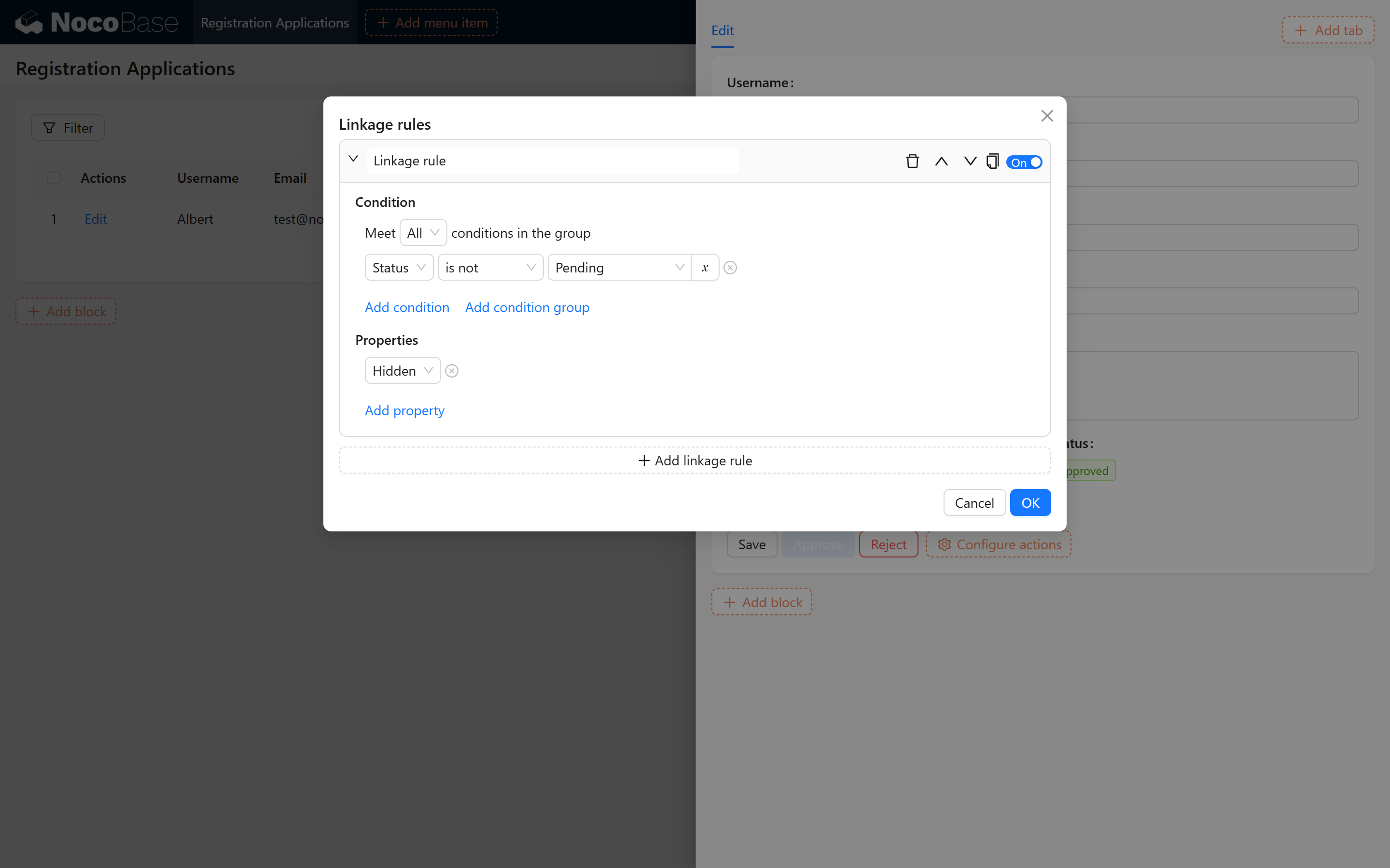 为防止重复操作,设置联动规则:当【状态】不为【待审核】时隐藏按钮。参考图示: