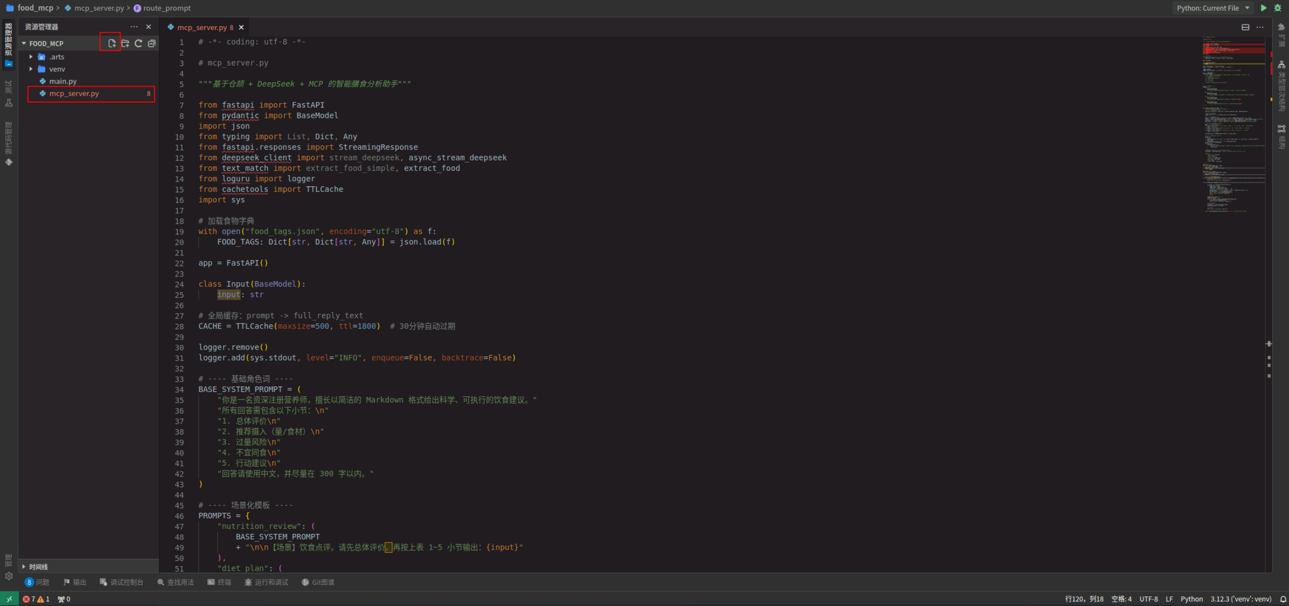 在 CodeArts IDE for Python 左侧资源管理器 > food_mcp 工程右侧的新建文件按钮,并将文件命名为mcp_server.py,下一步在此文件中开始编写代码。