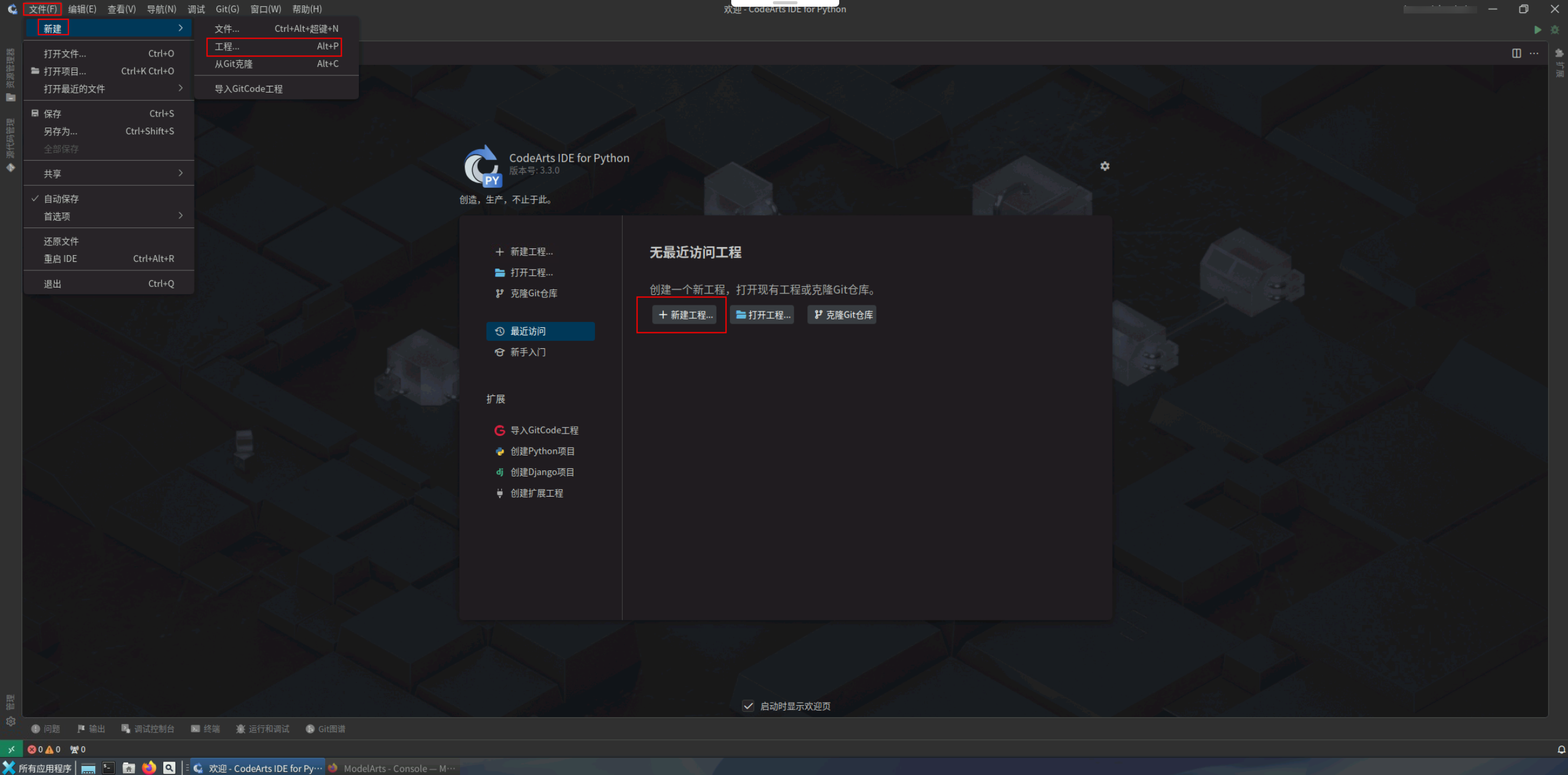在新打开的 CodeArts IDE for Python 的提示界面或通过文件 > 新建 > 工程,打开新建工程配置界面。