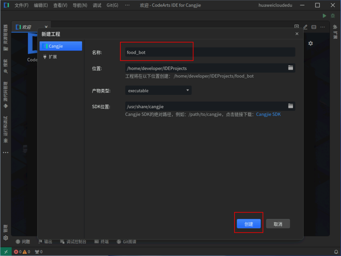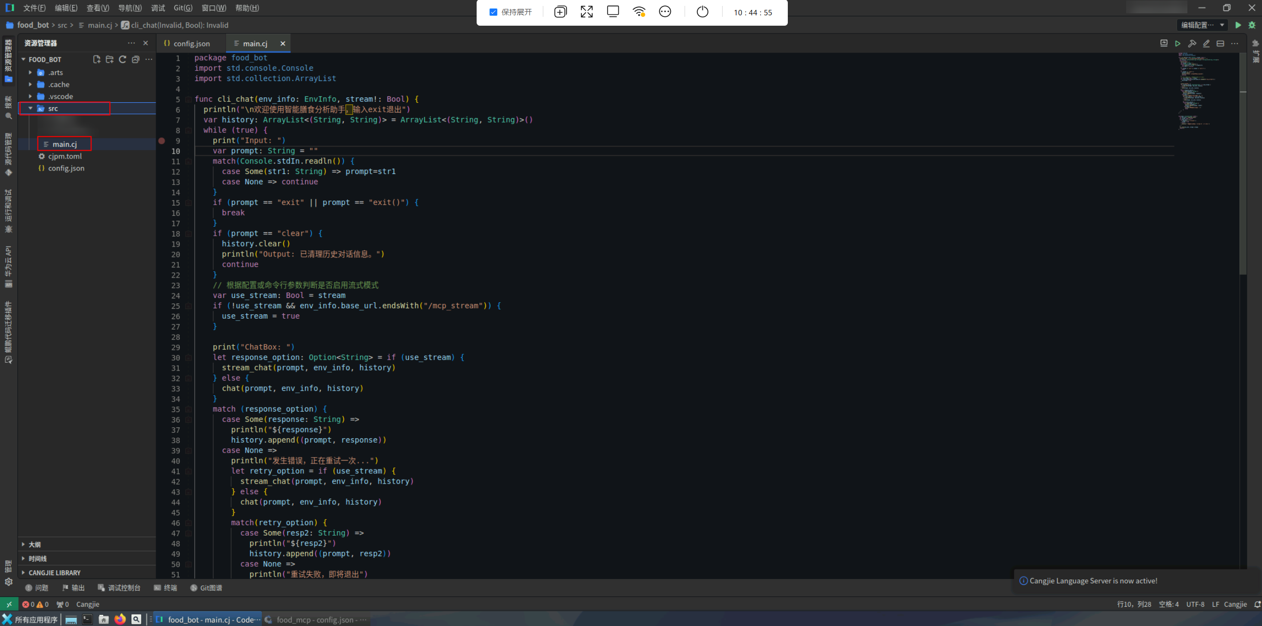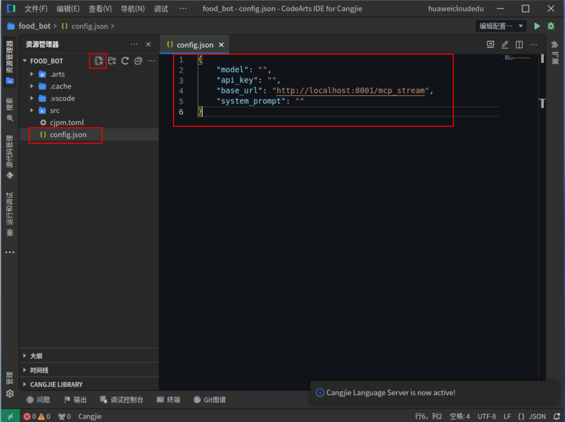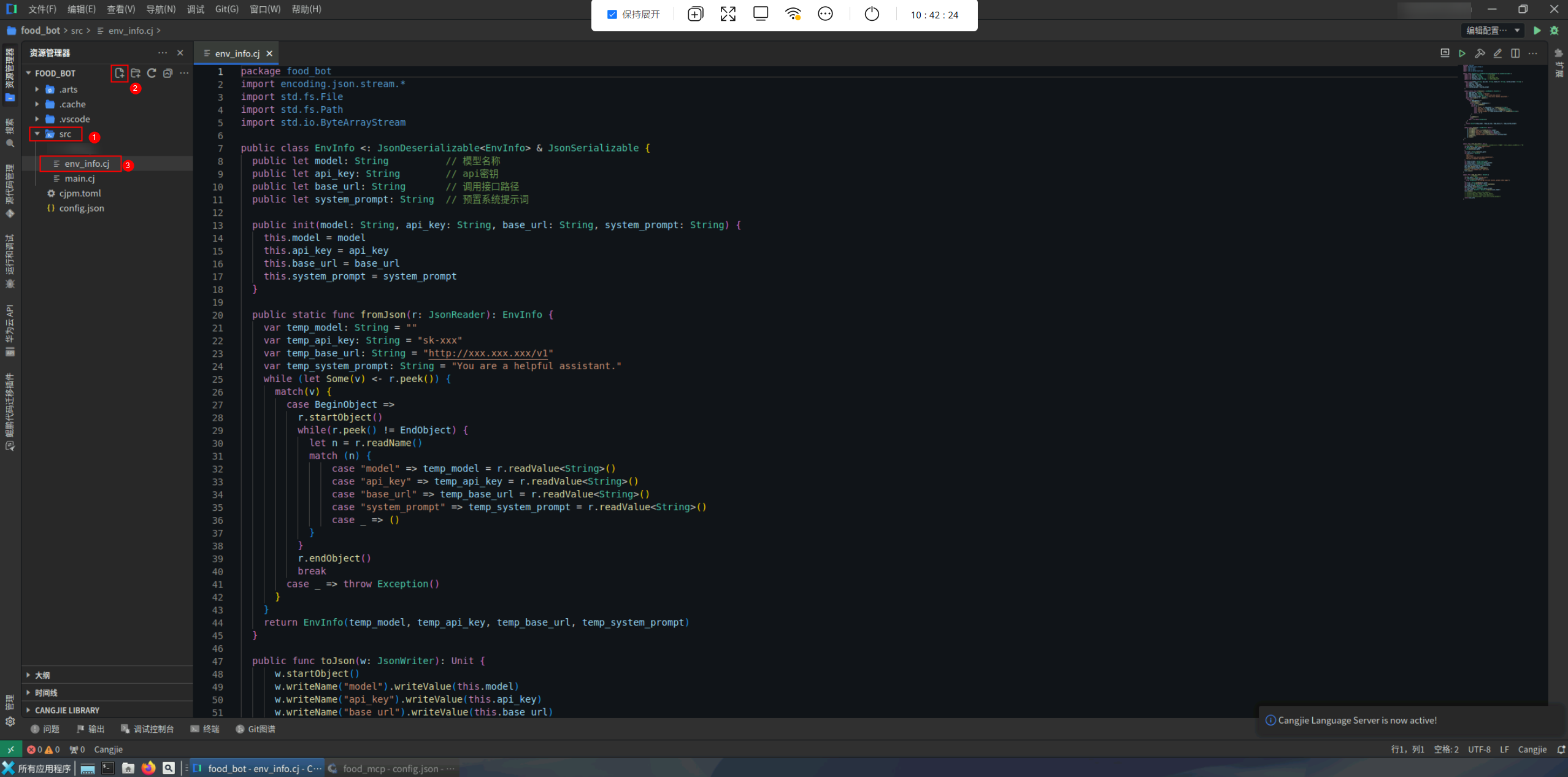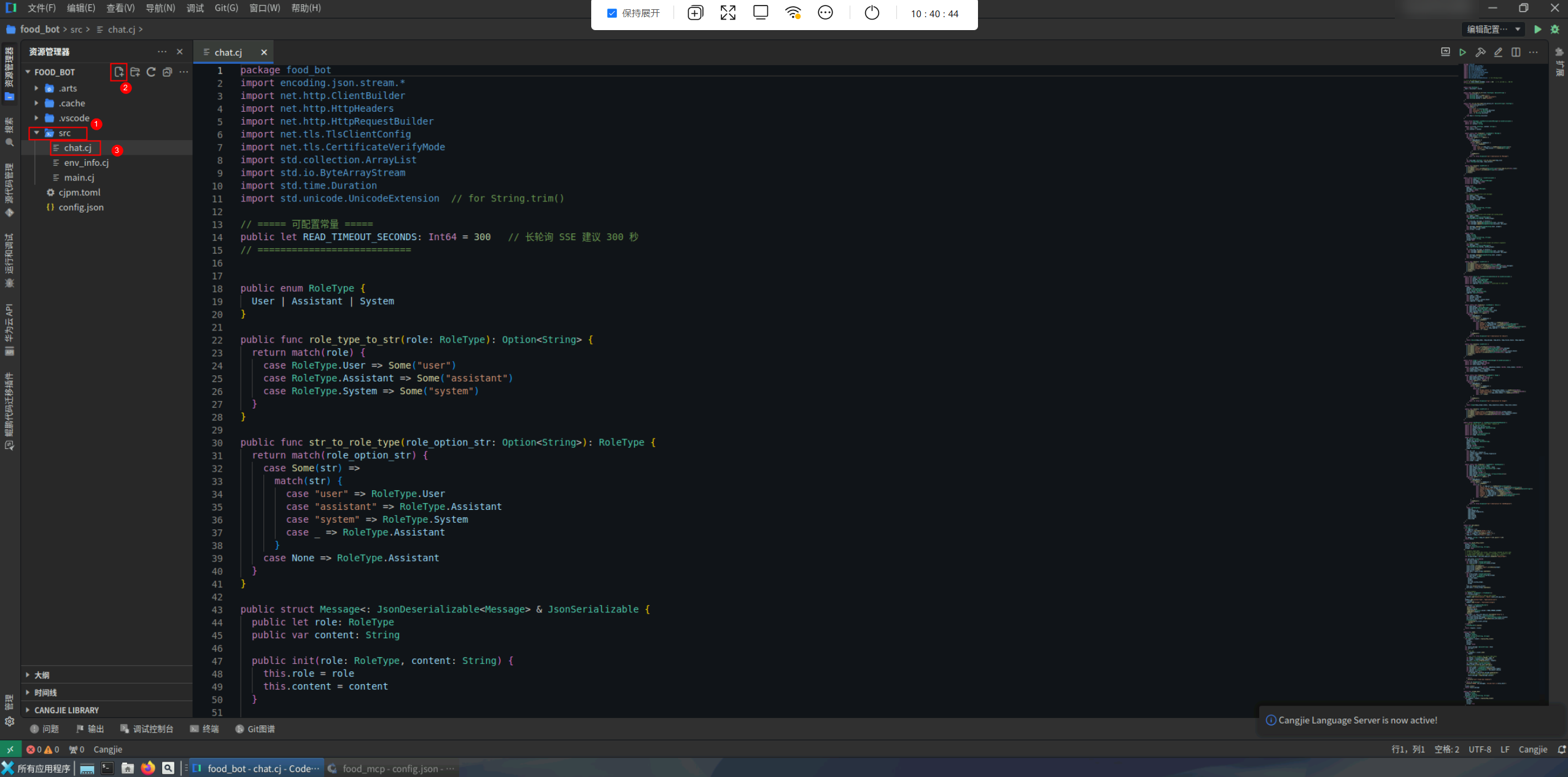在 CodeArts IDE for Cangjie 左侧资源管理器 > food_bot 工程目录中找到 src 目录,点击 food_bot 工程右侧的新建文件按钮,将文件命名为chat.cj,下一步在此文件中开始编写代码。