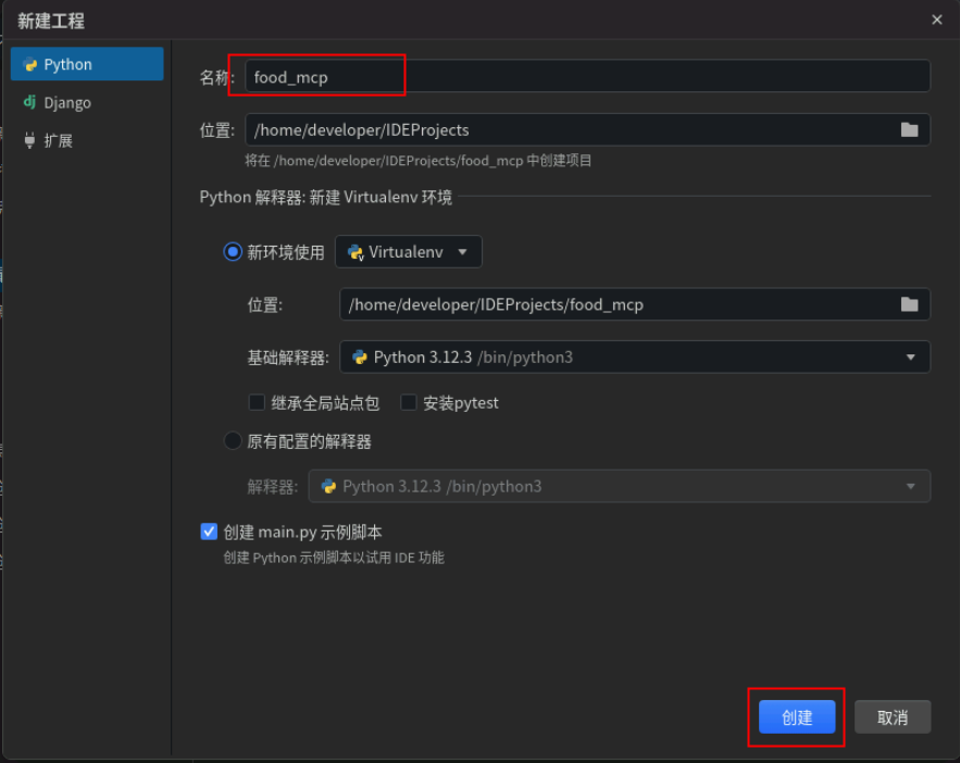 在新建工程配置界面,编辑项目名称为food_mcp,然后点击创建。