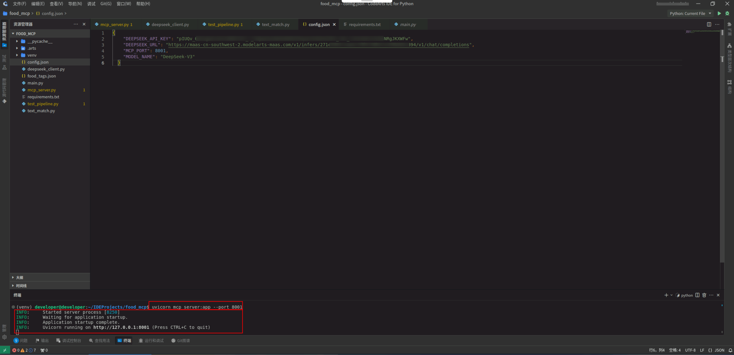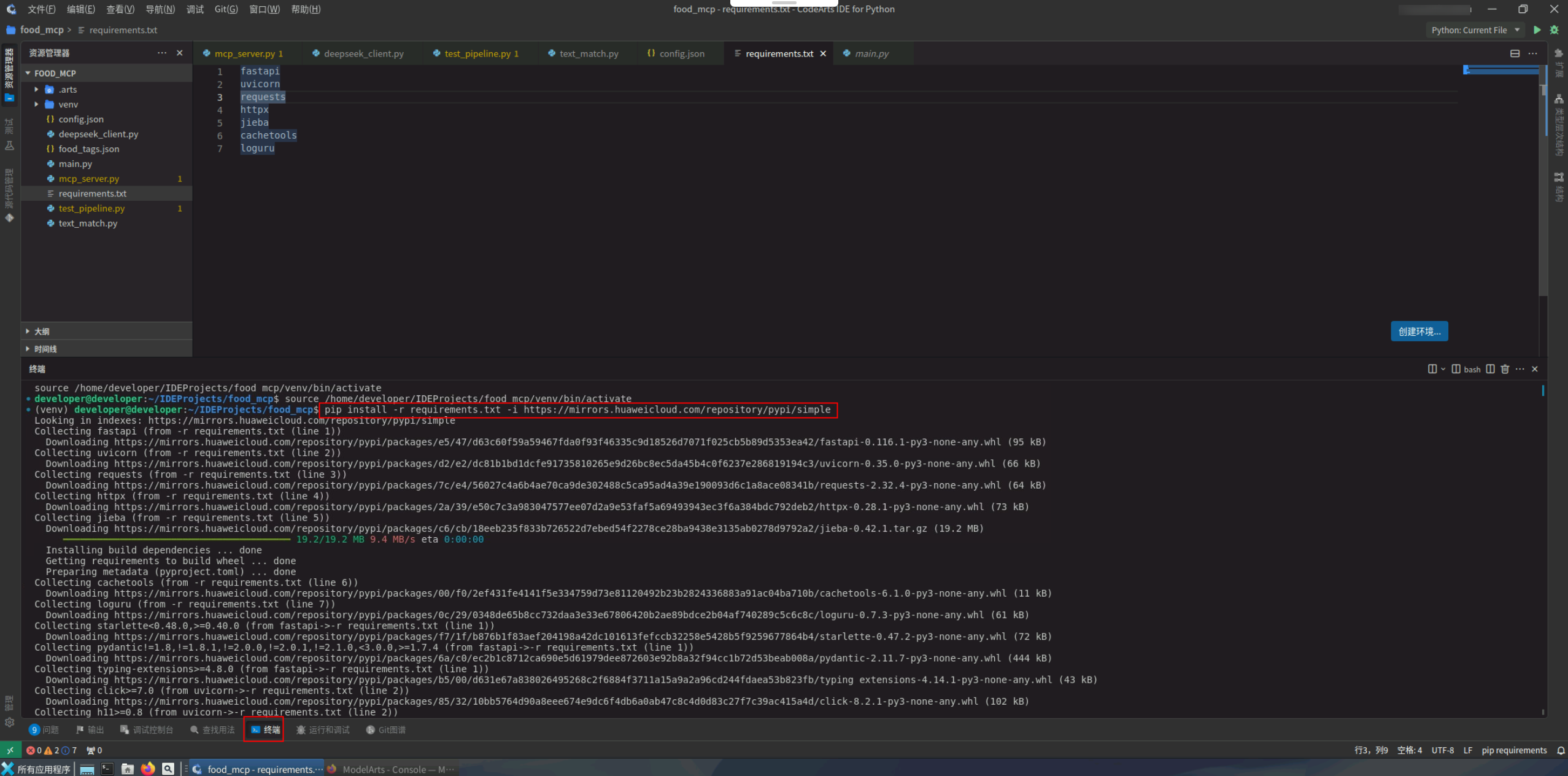 - 华为开发者空间 - 云主机 桌面打开 CodeArts IDE for Python 构建本地 MCP 服务项目,实现饮食语义解析、食物识别、健康标签打标、Prompt 生成与请求路由。