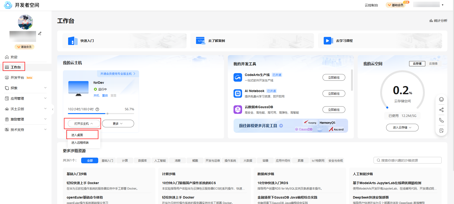 进入华为开发者空间工作台界面,点击打开云主机 > 进入桌面连接云主机。