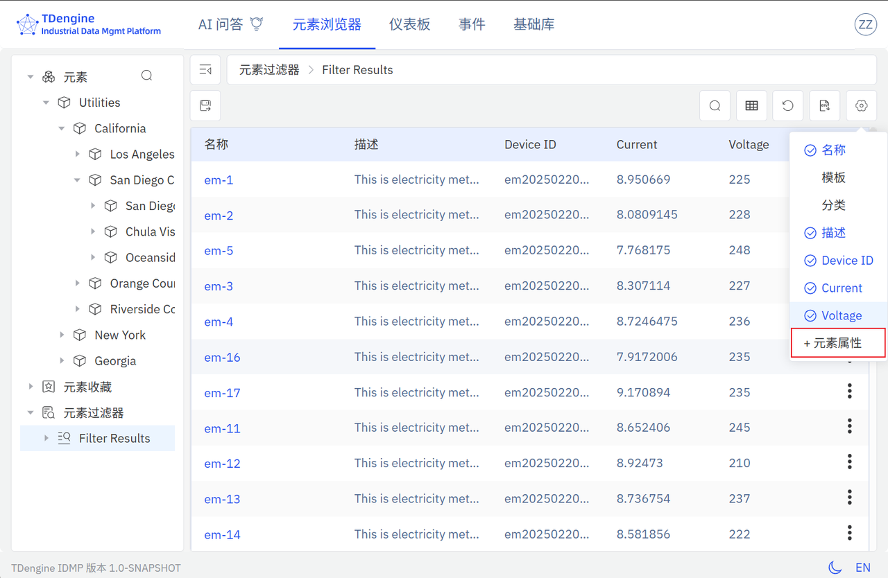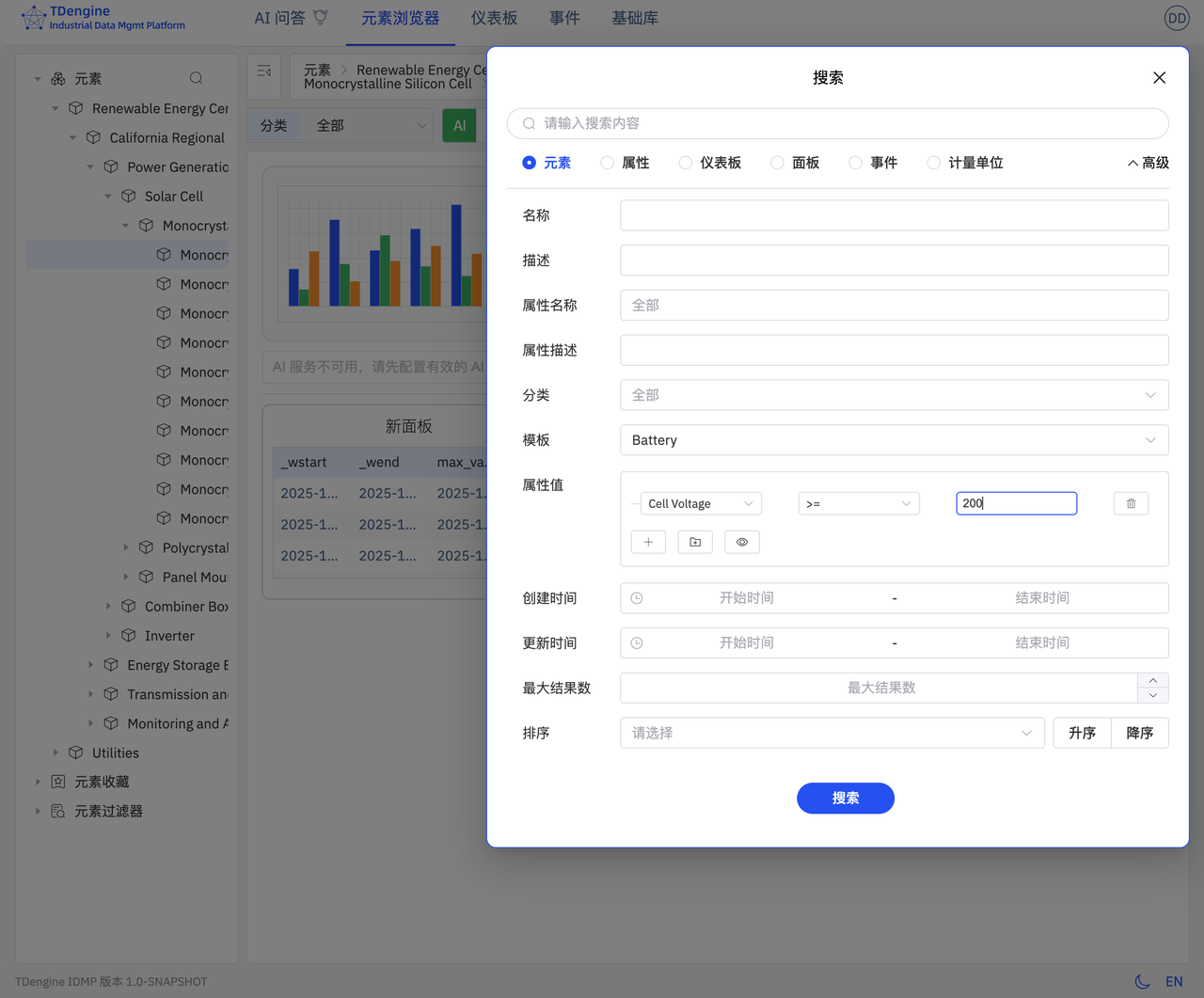 该版本中,TDengine IDMP 为属性引入了高级条件搜索能力,支持在无需编写代码的情况下,对多个属性条件进行组合筛选。业务人员可以围绕具体问题,自主设定筛选条件,在大量设备与测点数据中快速定位目标对象或数据范围。这一能力使运维人员能够更高效地开展故障排查与根因分析,也为工艺人员在不同参数与批次条件下进行对比分析提供了更灵活的探索方式,同时减少了日常巡检与监控过程中对人工筛查和 IT 配置的依赖。