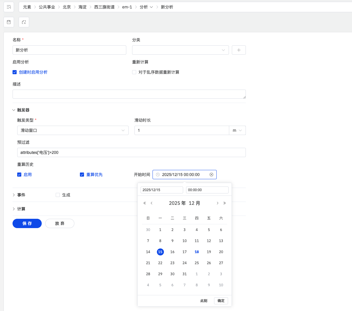 TDengine IDMP 的分析能力支持在触发前对数据范围进行预过滤,并在分析创建后对历史数据进行重新计算。通过预过滤机制,分析可以限定在特定区域、设备或范围内执行,避免对全量数据进行无效扫描,从而提升大规模分析场景下的执行效率;而历史重算能力则使分析规则或模型在调整后,能够被一致地应用到已有历史数据上,保证不同时间段分析结果的可比性与一致性。这一组合能力既支持分析在规模扩大时保持性能可控,也为分析规则和算法的持续优化、回溯验证提供了基础条件。