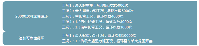 在疲劳台架试验机上,固定车架中回位置,模拟各个工况下,吊起重物旋转一圈为一个循环,在四个支腿处施加相应支反力,20000 次内不出现开裂可判断合格,具体加载工况如下表所示: