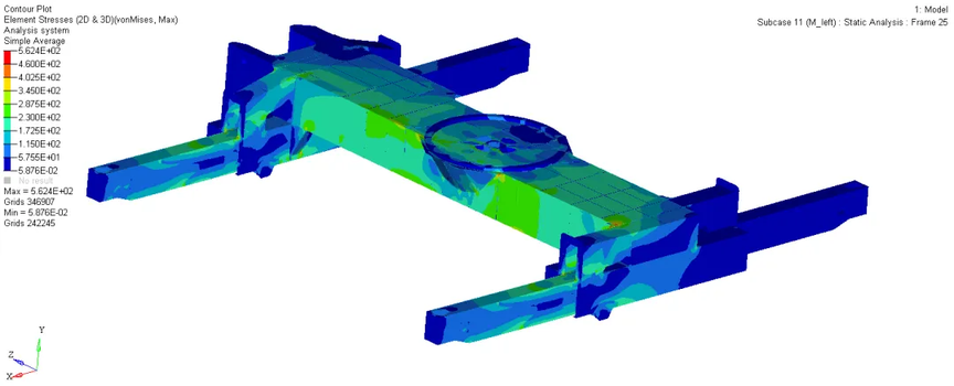 本文应用 HyperWorks 中的 OptiStruct 对起重机车架进行了轻量化设计,调整车架截面尺寸和部分板件的厚度。经过优化,车架主焊接结构减重 253KG(5%),刚度性能比优化前略有提升,应力满足要求,吊载应力测试试验及可靠性试验均满足要求。